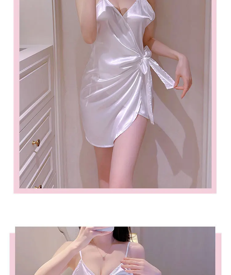 White Bow Mini Tank Dress Sweet Fashion Korean Women V Neck  New Lingerie Uniform Ice Silk Robe Dress Elegant